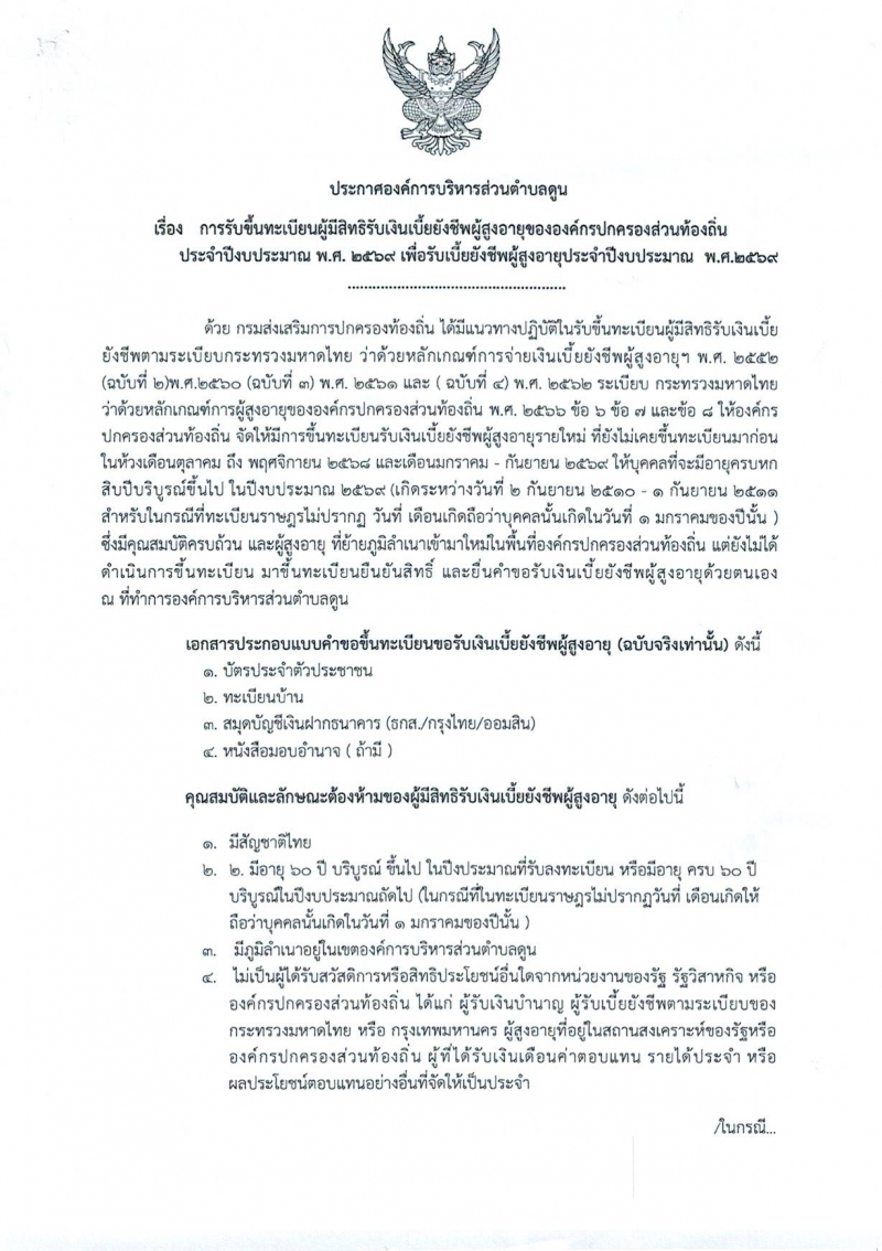 ประกาศองค์การบริหารส่วนตำบลดูน เรื่อง การรับขึ้นทะเบียนผู้มีสิทธิรับเงินเบี้ยยังชีพผู้สูงอายุขององค์ก