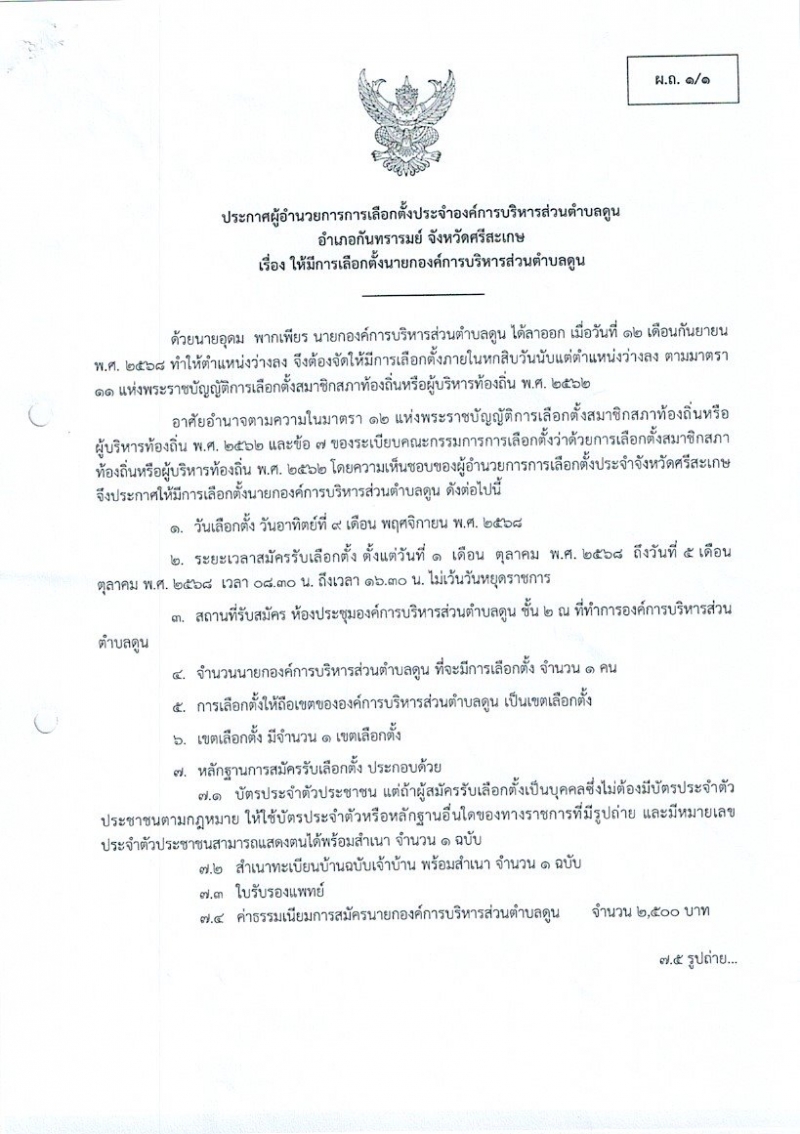 ประกาศผู้อำนวยการการเลือกตั้งประจำองค์การบริหารส่วนตำบลดูน อำเภอกันทรารมย์ จังหวัดศรีสะเกษ เรื่อง ให้ม