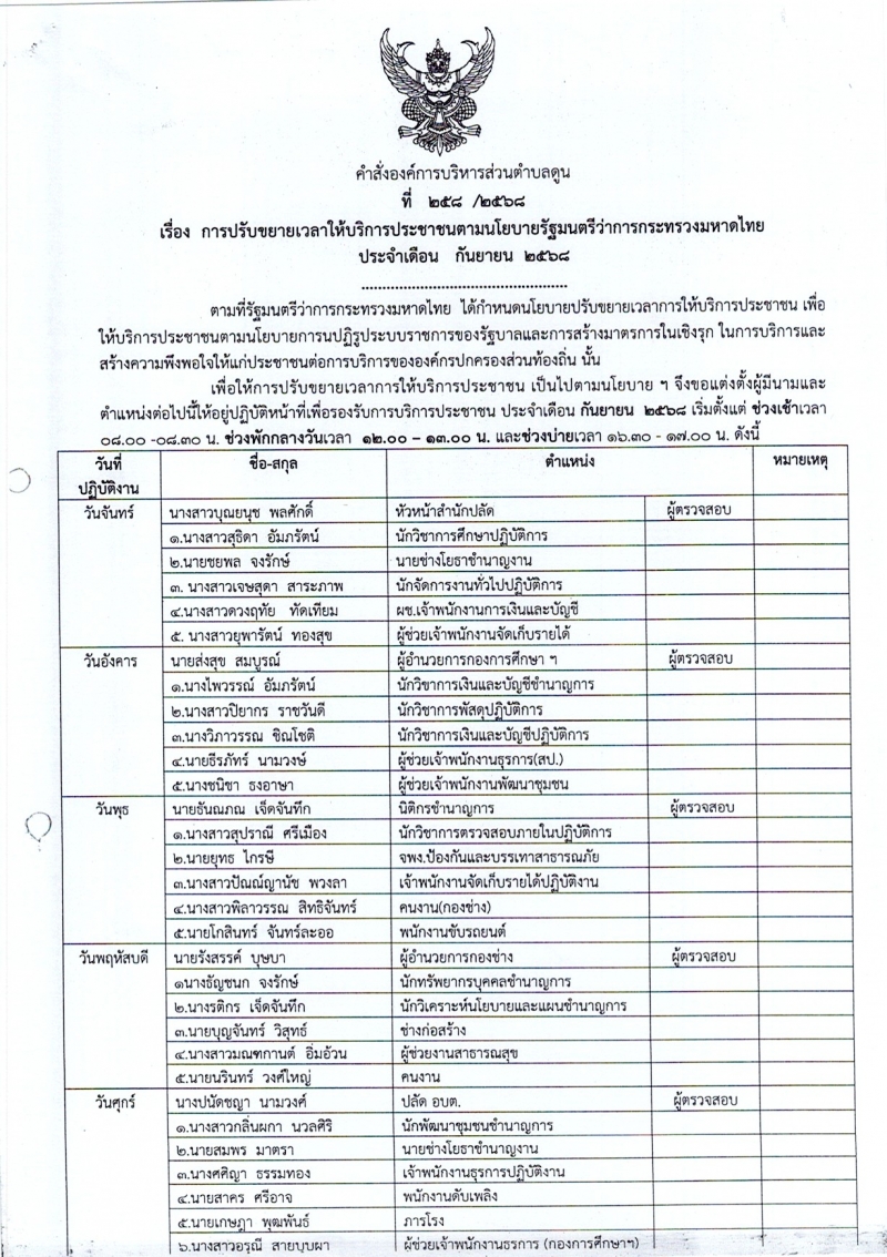คำสั่งองค์การบริหารส่วนตำบลดูน ที่ 258/2568 เรื่อง การปรับขยายเวลาให้บริการประชาชนตามนโยบายรัฐมนตรีว่าการกระ