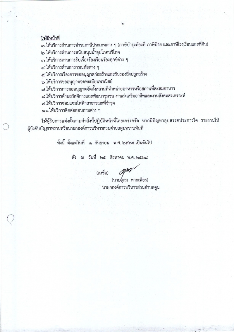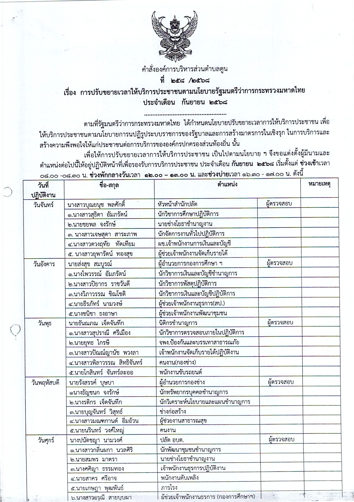 คำสั่งองค์การบริหารส่วนตำบลดูน ที่ 258/2568 เรื่อง การปรับขยายเวลาให้บริการประชาชนตามนโยบายรัฐมนตรีว่าการกระทรวงมหาดไทย ประจำเดือน กันยายน 2568