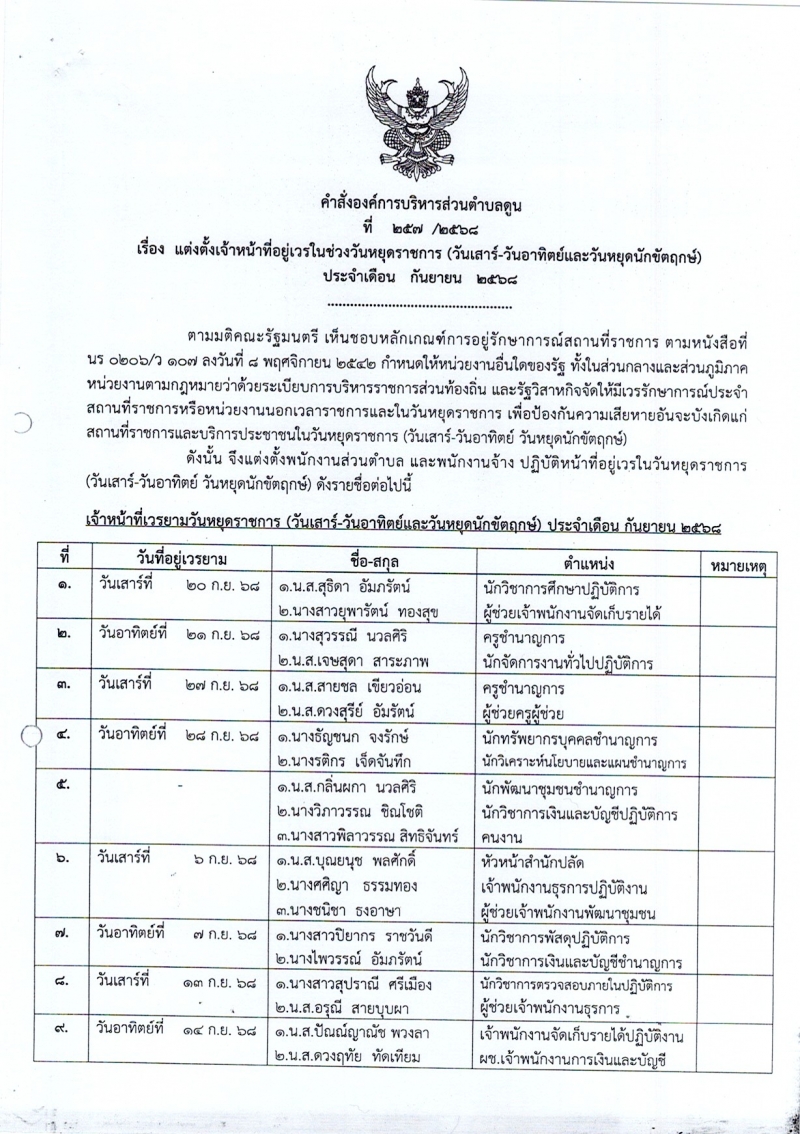 คำสั่งองค์การบริหารส่วนตำบลดูน ที่ 257/2568 เรื่อง แต่งตั้งเจ้าหน้าที่อยู่เวรในช่วงวันหยุดราชการ (วันเสาร์-วันอาทิตย์และวันหยุดนักขัตฤกษ์) ประจําเดือน กันยายน 2568