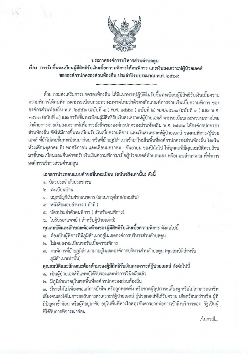 ประกาศองค์การบริหารส่วนตำบลดูน เรื่อง การรับขึ้นทะเบียนผู้มีสิทธิรับเงินเบี้ยความพิการให้คนพิการ และเงินสงเคราะห์ผู้ป่วยเอดส์ ขององค์กรปกครองส่วนท้องถิ่น ประจำปีงบประมาณ พ.ศ. 2569