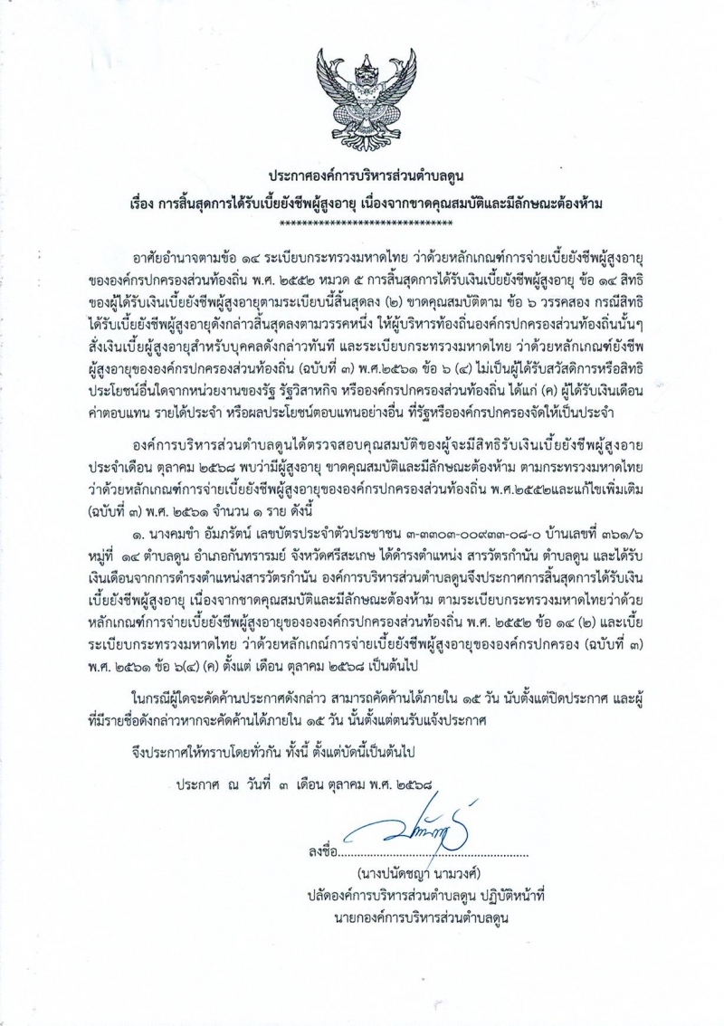ประกาศองค์การบริหารส่วนตำบลดูน เรื่อง การสิ้นสุดการได้รับเบี้ยยังชีพผู้สูงอายุ เนื่องจากขาดคุณสมบัติและมีลักษณะต้องห้าม