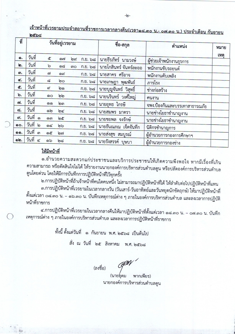 คำสั่งองค์การบริหารส่วนตำบลดูน ที่ 257/2568 เรื่อง แต่งตั้งเจ้าหน้าที่อยู่เวรในช่วงวันหยุดราชการ (วันเสาร์-วันอาทิตย์และวันหยุดนักขัตฤกษ์) ประจําเดือน กันยายน 2568